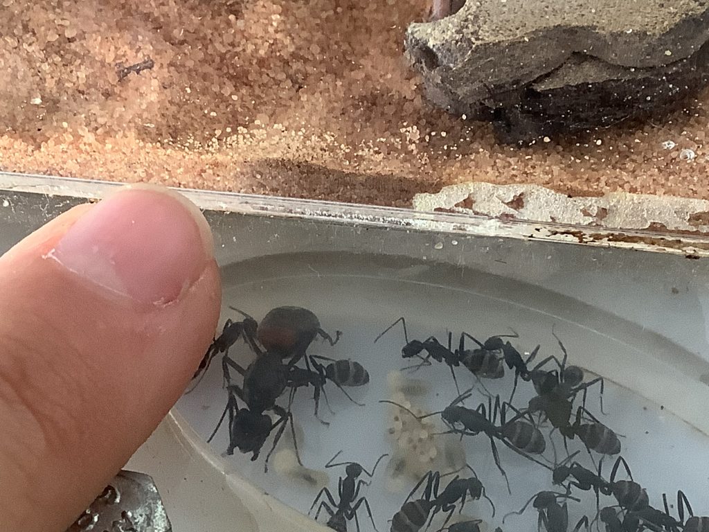 Las camponotus van muy bien. Les he dado una palometa de comer y no han tardado en despedazarla. Se han esparcido por el hormiguero ya que les he renovado la humedad y no les gusta. Las Camponotus Cruentatus son hormigas de climas desérticos.