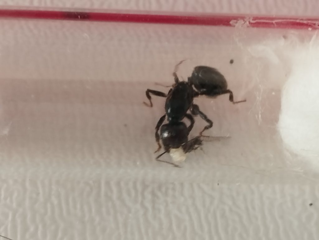 Resulta que recientemente me he percatado de que su comportamiento ha cambiado. Mis hormigas COMENZARON A MATAR A SUS PROPIAS HERMANAS. Esto me dejó confundido y sorprendido. De vez en cuando se veía cómo una hormiga empezaba a limpiar a otra y de repente se ponía agresiva y le mordía en el gángster hasta reventarlo. La otra hormiga moría y acto seguido se la comían. Pasaron de ser 71 a ser 60-58.