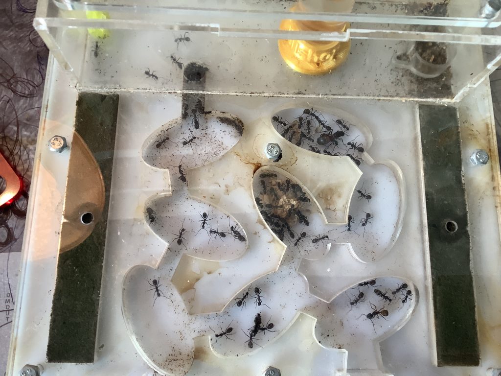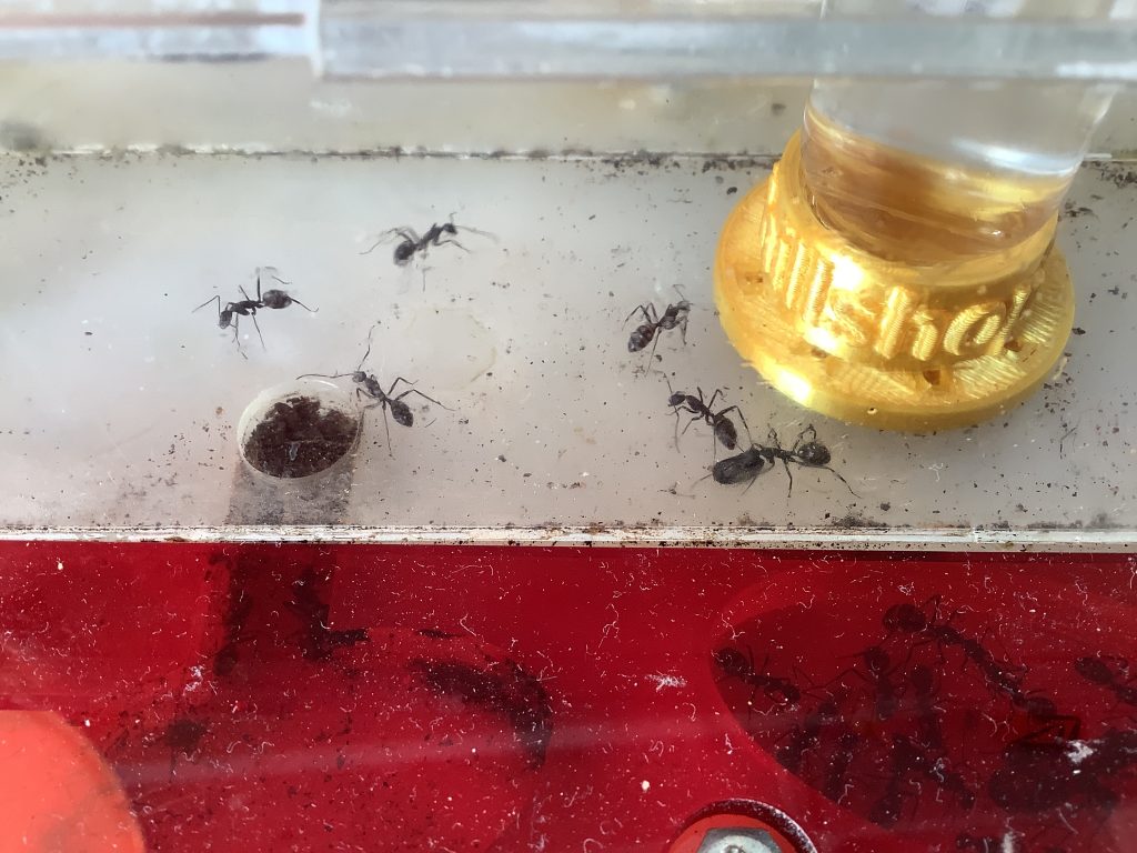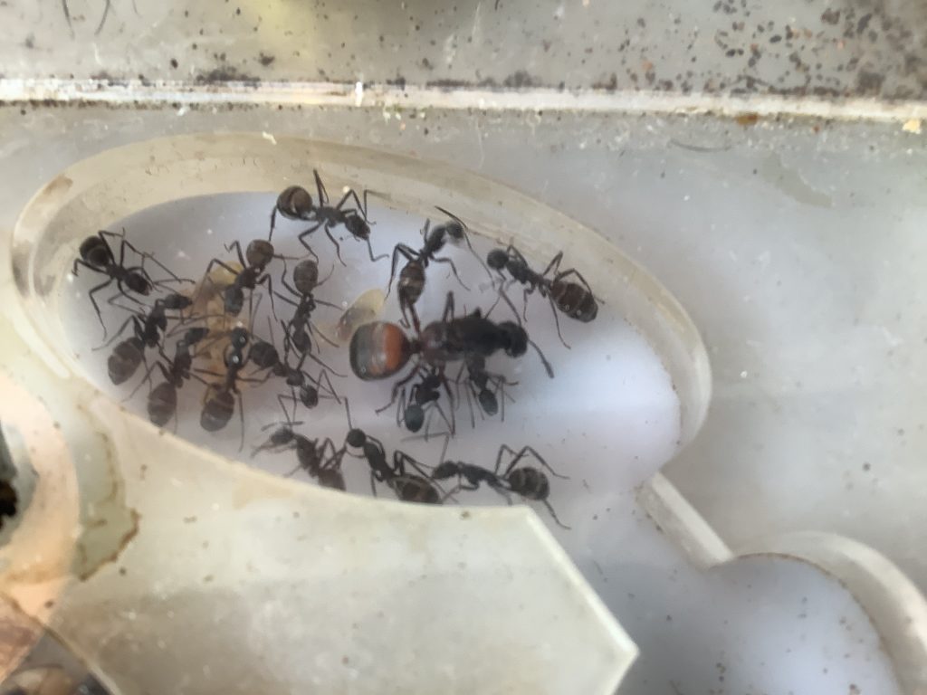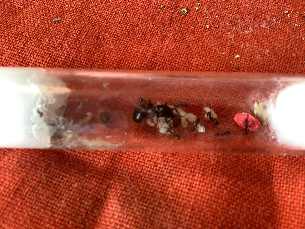 siempre he estado mostrando 8 reinas pero si no me equivoco, dije que tenía más. Así es, tengo una reina en un hormiguero de arena y otra en un terrario. He decidido que la 9 sea la del terrario y la 10 la del hormicefa (que es el nombre del hormiguero). Pensaba que la reina 10 estaría muerta pero hace poco me puse a humedecer su hormiguero y ví que había una galería en la que se podía ver a la reina. La ví con muchos huevos pero desconozco si hay larvas o pupas.