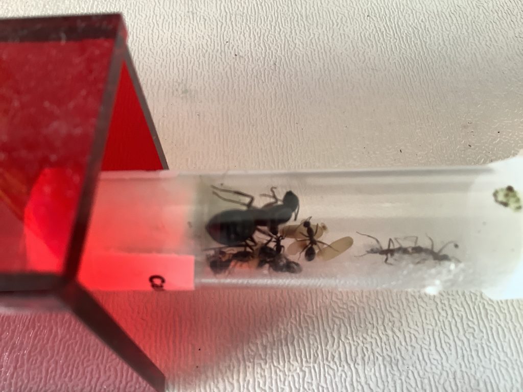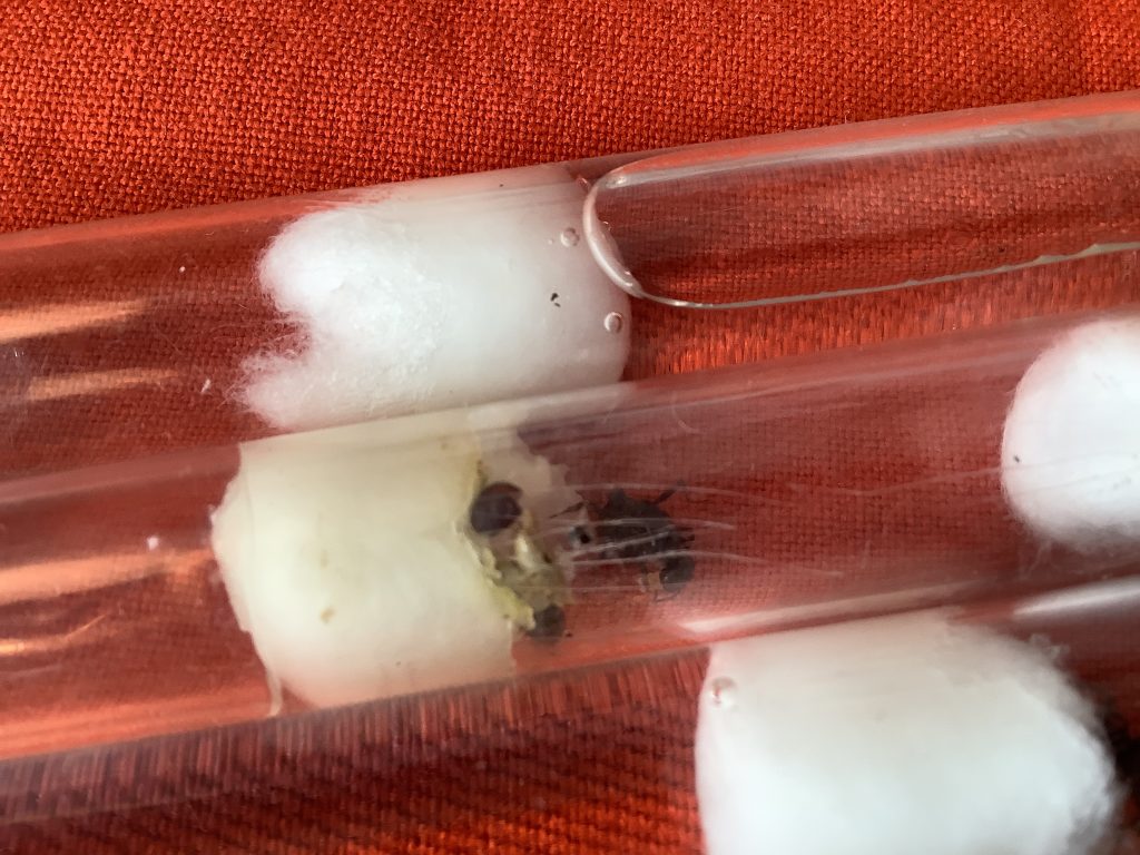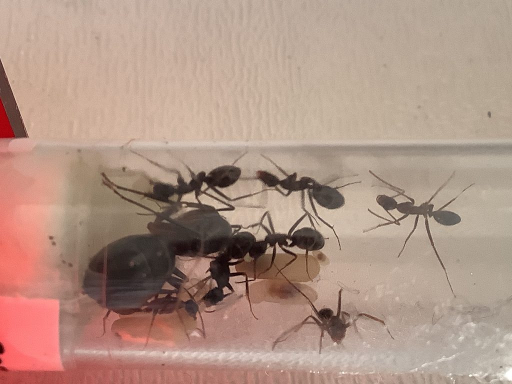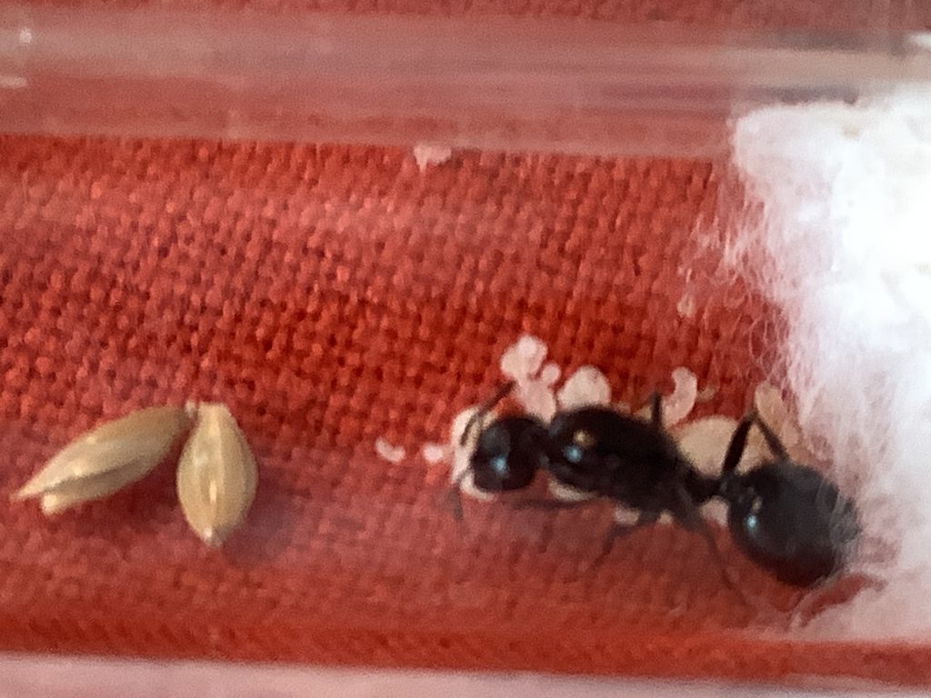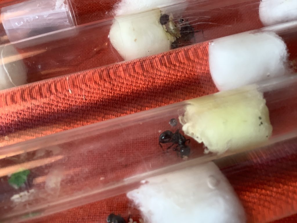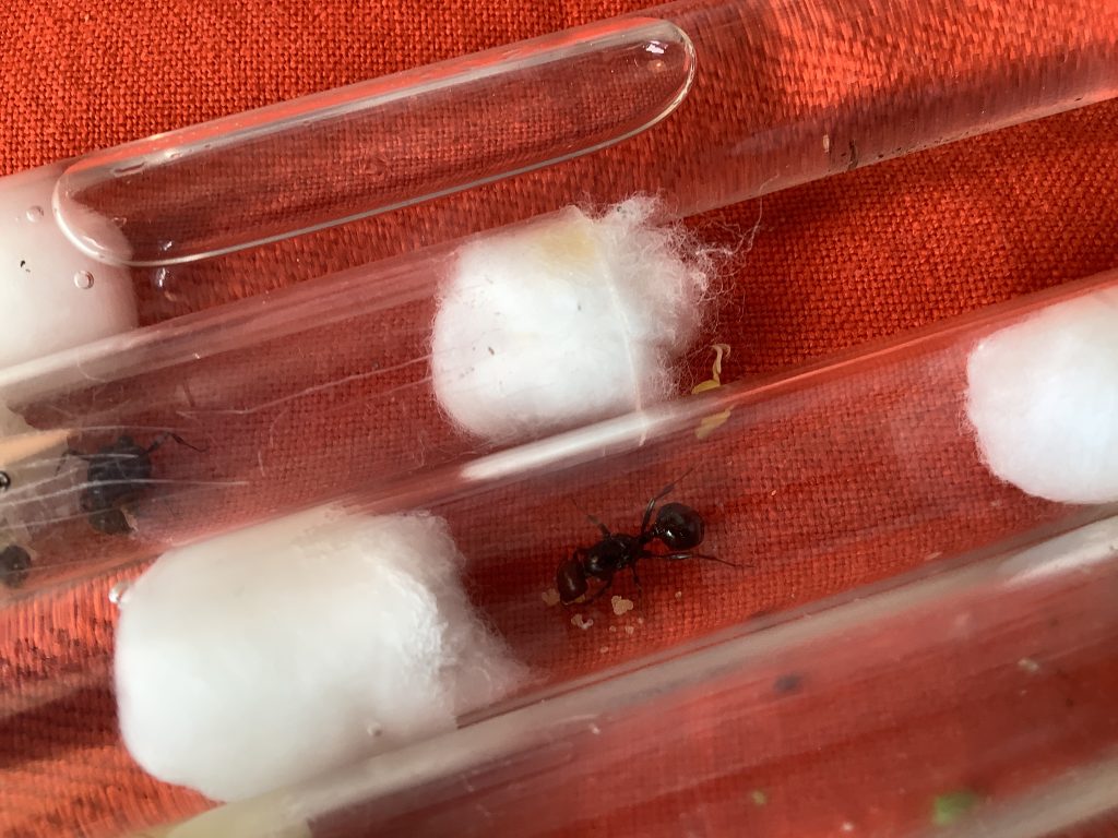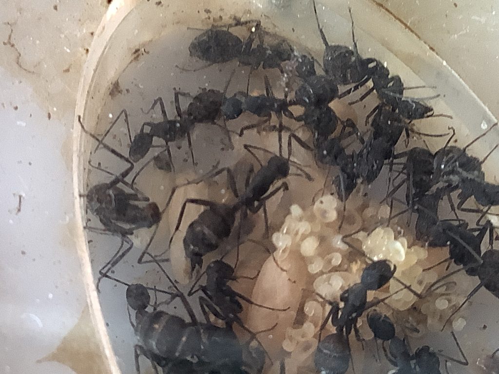 Hace bastante,un mes y medio o por ahí, cacé una reina en Dénia y la he identificado como una Camponotus Piceus. La dejé en un tubo de ensallo y una semana después puso huevos. Comparado con las Messor los puso muy pronto. Actualmente cuenta con unos 10-12 huevos y quizá alguna larva.