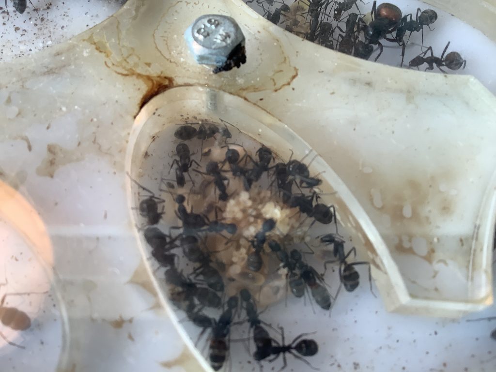 Esta reina la capturé hace menos de un mes. Sé que es del género Formica pero no estoy seguro de la especie. Creo que es Formica cirenea. Al día siguiente de su captura se quitó las alas y puso huevos. Cada día ponía más y a día de hoy tiene larvas basante desarrolladas. Me parece increíble ra rapidez a la que pone huevos y estos pasan a larva. Espero ver nacimientos en poco tiempo.