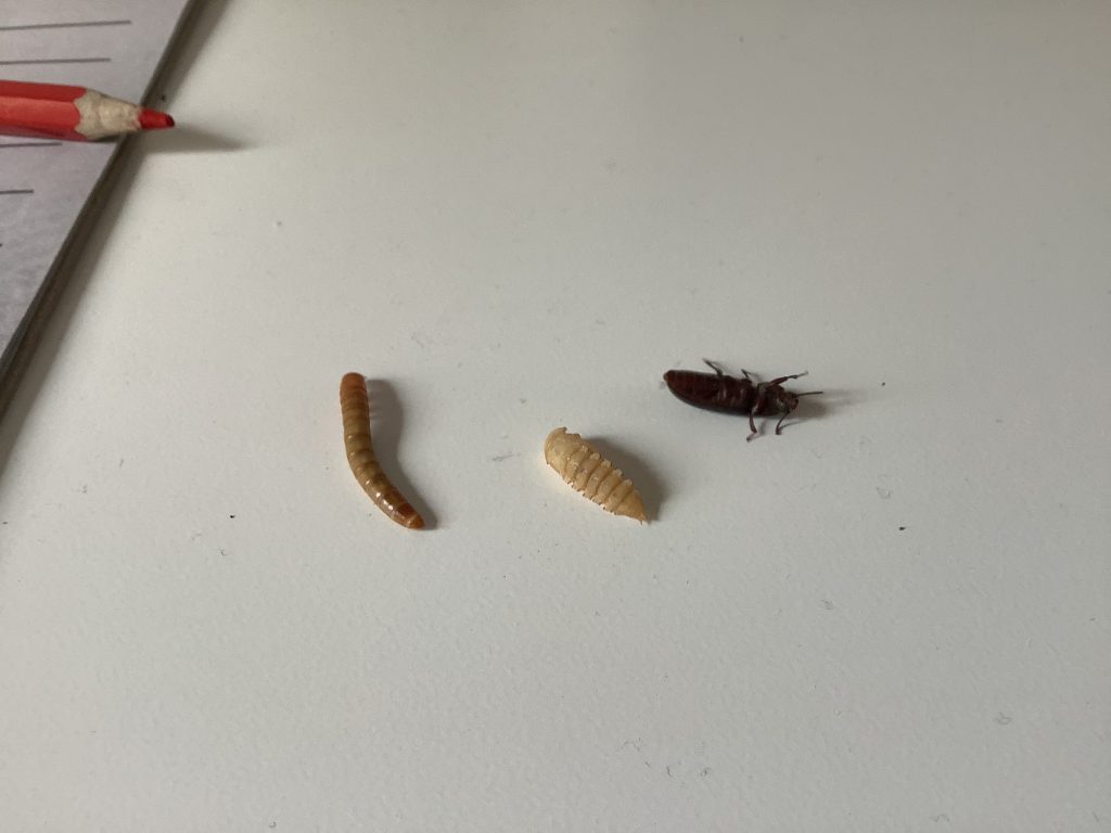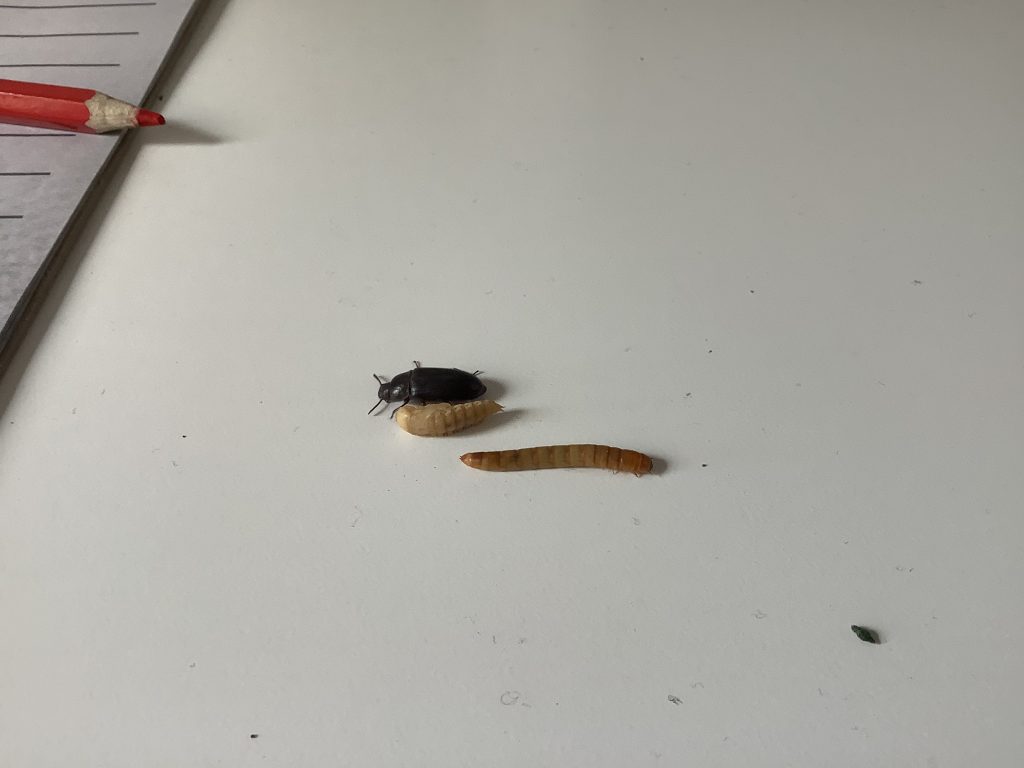 Sigo poniéndome al día. Tengo un terrario que en realidad es un acuario de 10 litros. Tiene unos cuantos inquilinos. Cuenta con tres escarabajos de tenebrios y una tijereta. Los escarabajos proceden de los tenebrios que son unos gusanos que me sirven de alimento para las hormigas. La tijereta vino junto con unos tomates que compramos. Para quien no lo sepa. Los tenebrios no se convierten directanente en escarabajos sino que pasan por estado de pupa primero igual que las hormigas y las mariposas. En el terrario tengo también una de estas pupas aunque anteriormente eran dos pero una se transformó hace poco.