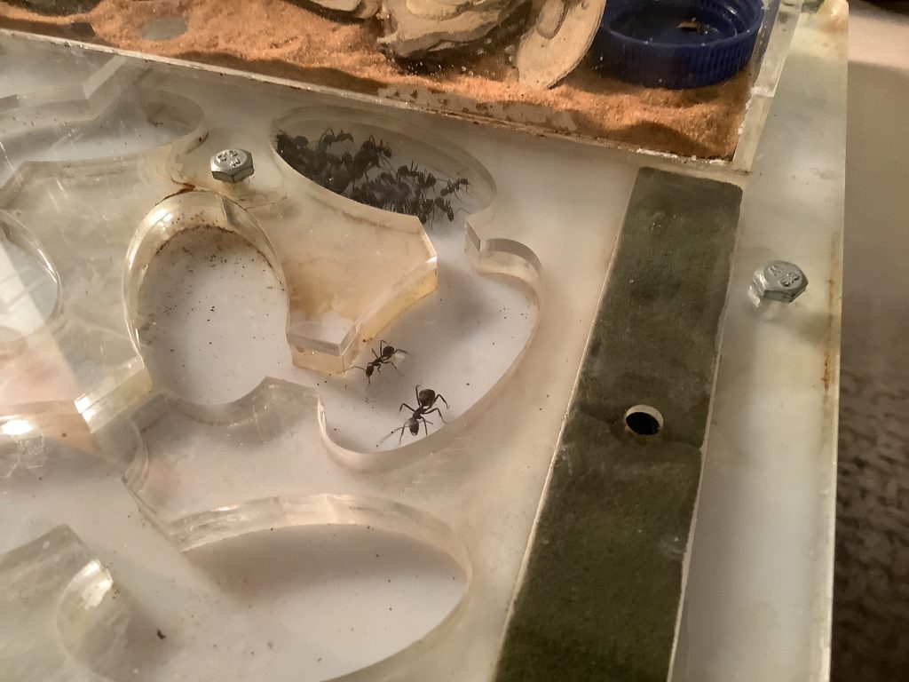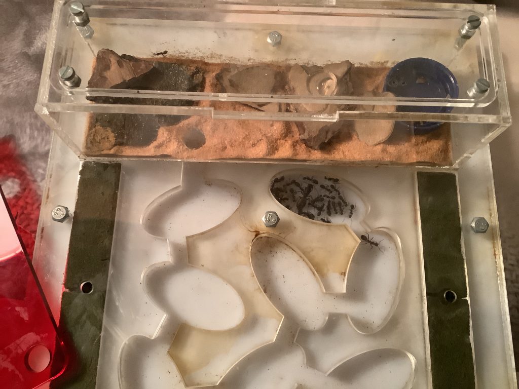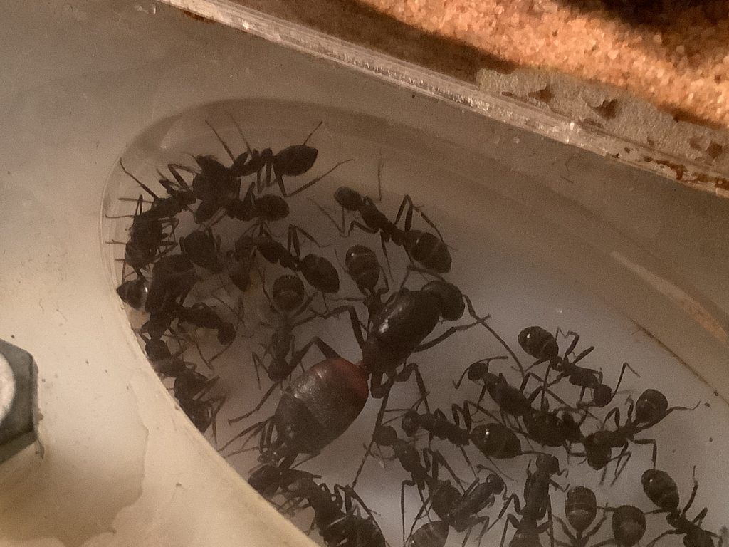 También tengo a una reina de crematogaster scutellaris en un hormiguero pequeño que fue madre de unas siete obreras. Estas eran de un pedido que hicimos a una tienda de hormigas. Por desgracia, no nos llegaron en las mejores condiciones y ahora tenemos solo a la reina. Y digo lo mismo. No puedo sacar fotos ya que no quiero molestarla para que se recupere y siga adelante.